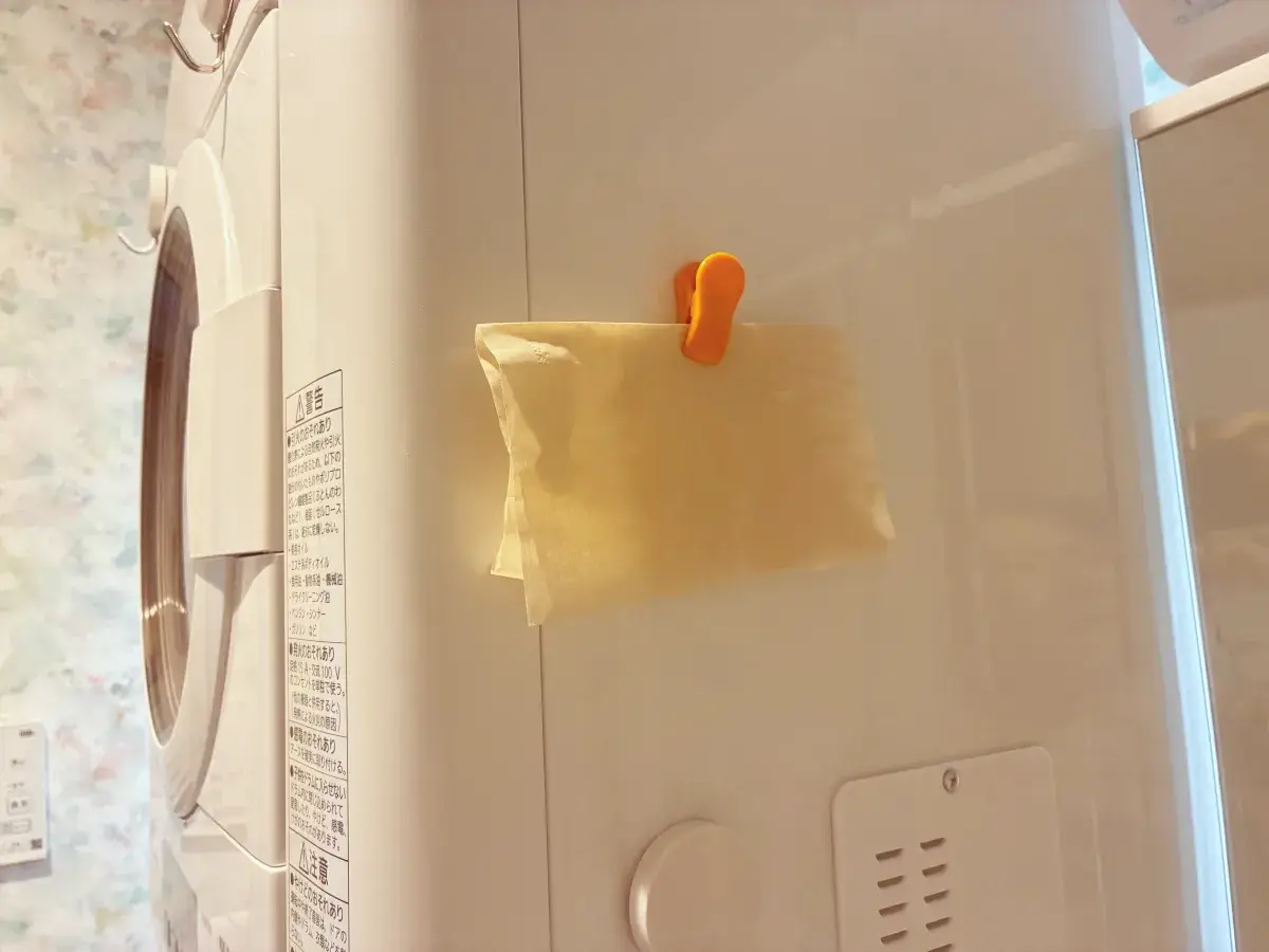 さらにマグネットがついているクリップを洗濯乾燥機につけて常にペーパーを挟んでおき、取りやすく目につきやすいようにしています。